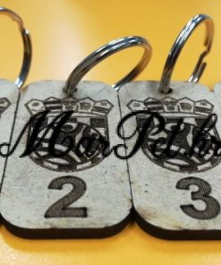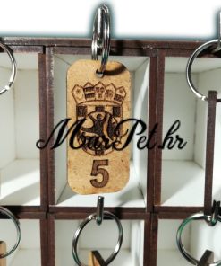 Privjesci za ključeve boje drveta sa graviranim brojem ključa i logom kluba ŠRC Trnje.